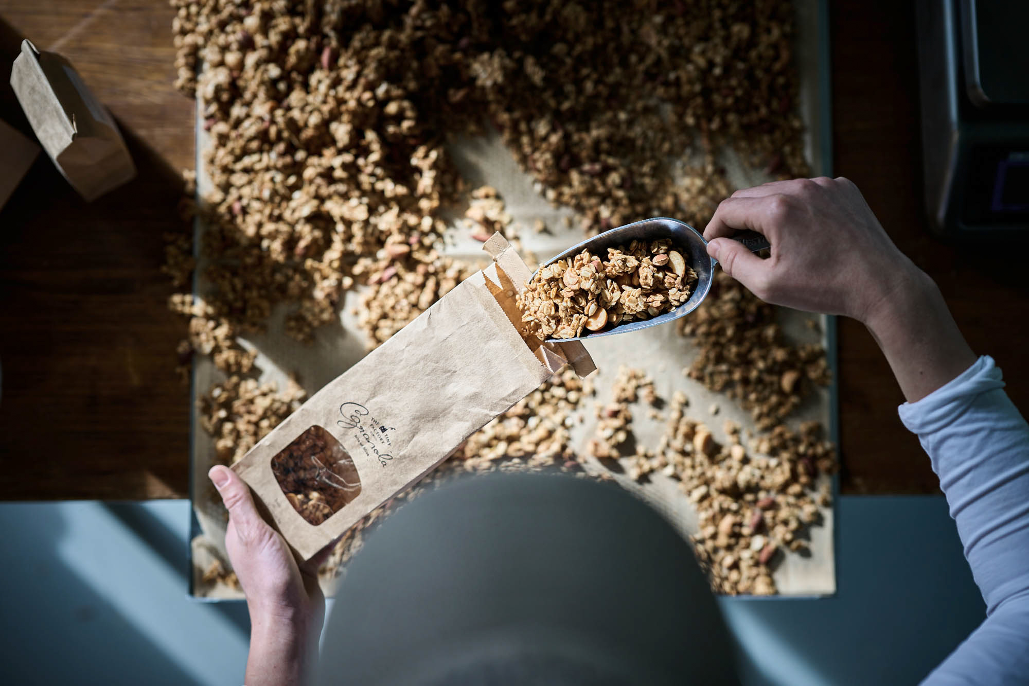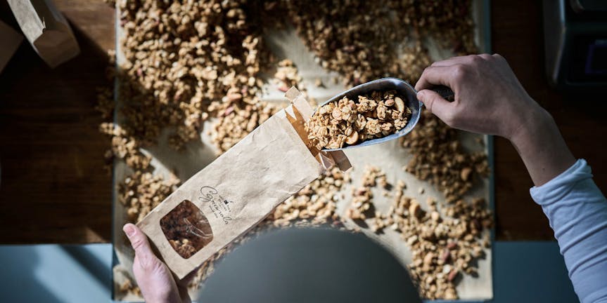 Wir montieren die Schürzen, mischen die Original-Rezeptur und heizen unseren Granolaofen auf. Die Besucher:innen müssen nicht nur dem Backduft verfallen sondern können durch die Scheiben auch zuschauen, wie wir frischestes und knusprigstes Nuss-Granola produzieren und abpacken.